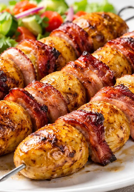 Zemiaky dôkladne umyte a osušte – nelúpte. Pripravte marinádu z lyžice oleja, lyžice tvarohu, lyžičky smotany a dvoch lyžičiek grilovacej zmesi. Zemiaky pozdĺžne rozrežte na polovice, ponorte do marinády a nechajte 2–3 hodiny odležať v chladničke. Anglickú slaninu nakrájajte na štvorcčeky a striedavo so zemiakmi napichnite na grilovacie ihly. Grilujte zprudka zo všetkých strán dozlatista. Podávajte so zeleninovým šalátom.
