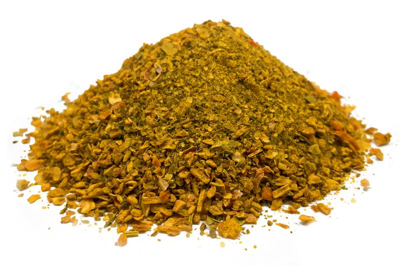 Typická receptúra stojí na cibuli a korení (čiernom a zelenom), ktoré dopĺňa paprika a kari; výrobcovia často pridávajú aj trochu petržlenu a stopové množstvo rastlinného tuku pre lepšie rozptýlenie vôní. Čierne korenie prináša plnú, „teplú“ korenistosť, zelené dodá ľahko bylinnú sviežosť. Sušená cibuľa sa pri tepelnej úprave rozvonia do tónov pripomínajúcich pomaly restovanú cibuľku – zmes tak pokrmom prepožičia pocit poctivého základu aj bez dlhej prípravy.